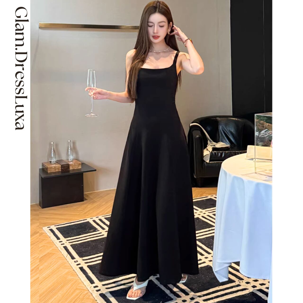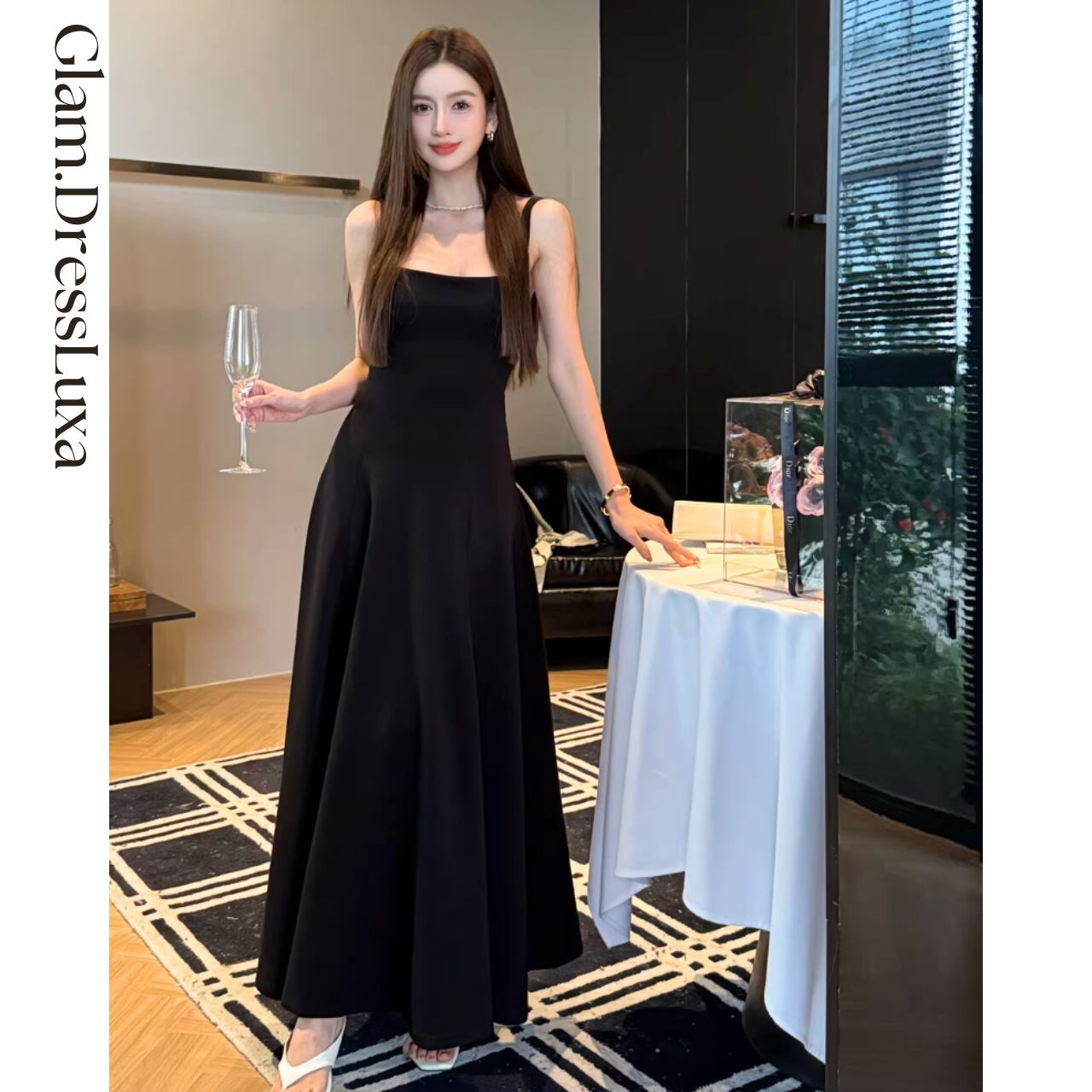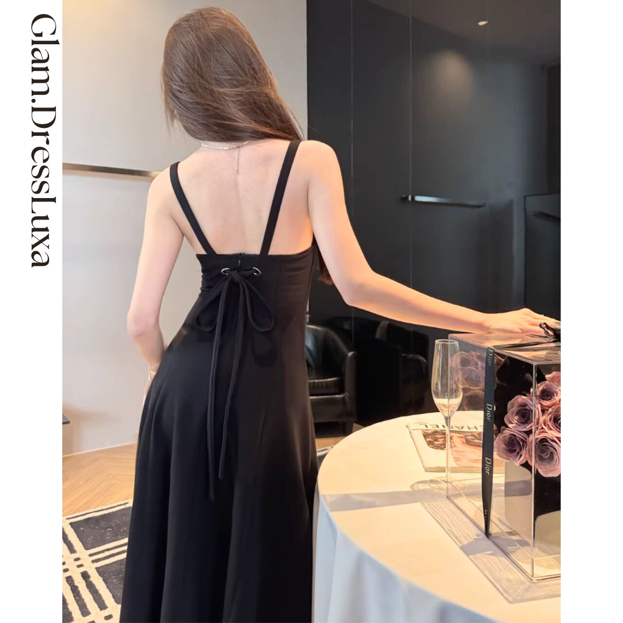 ・華奢なストラップと大胆に開いたバックデザインが、女性らしさを引き立てるロングドレス。