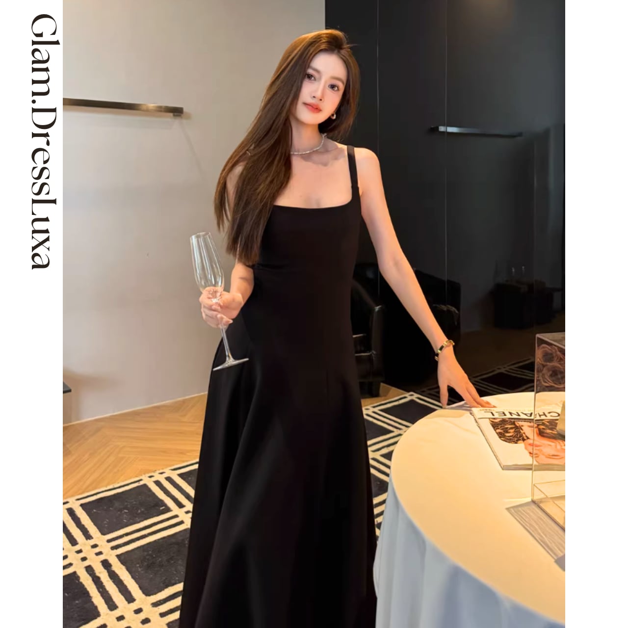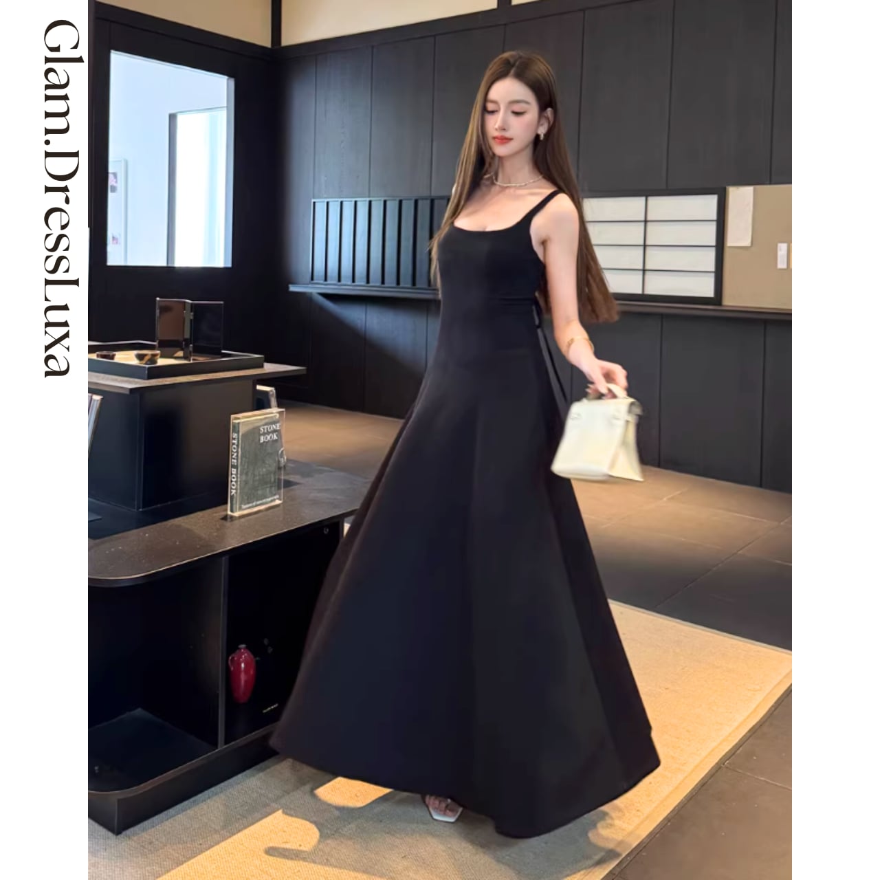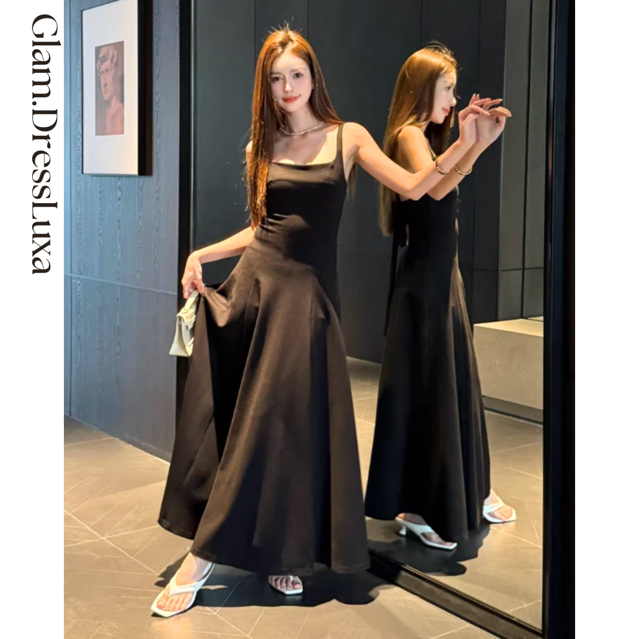 ・華奢なストラップと大胆に開いたバックデザインが、女性らしさを引き立てるロングドレス。