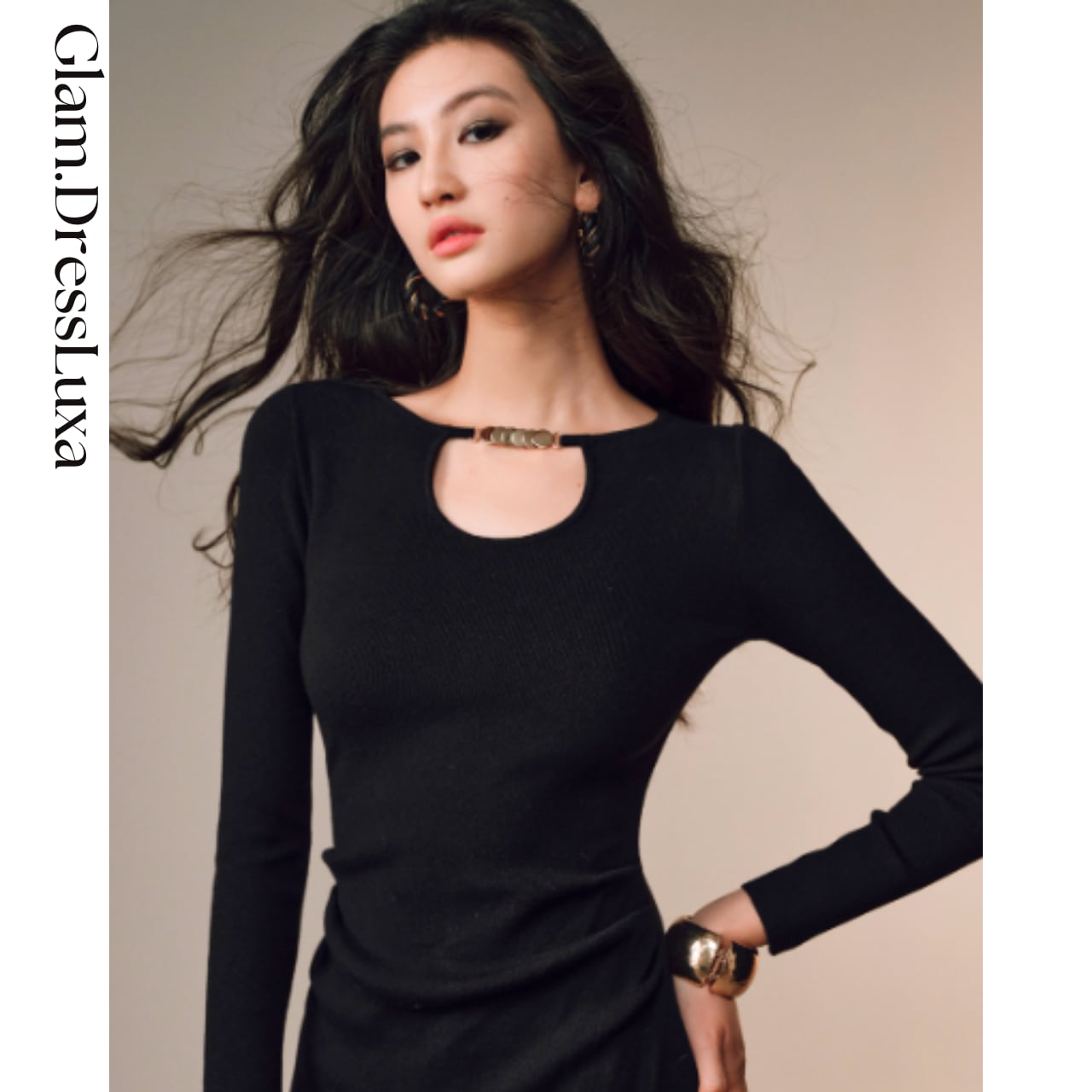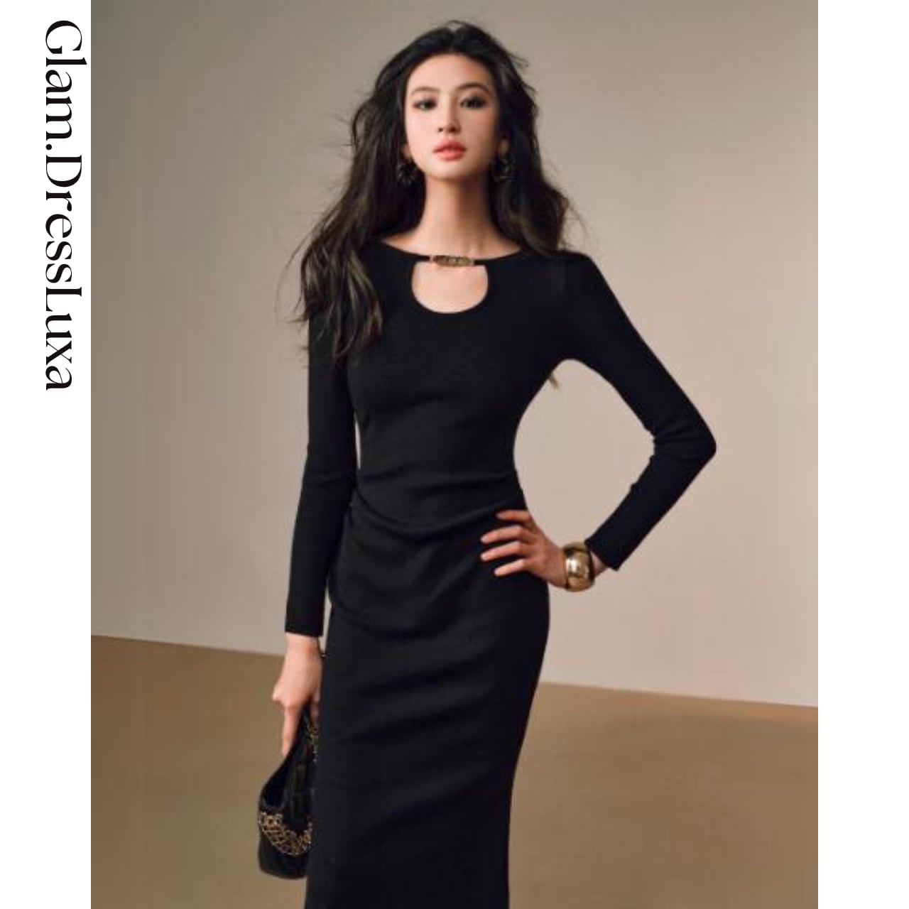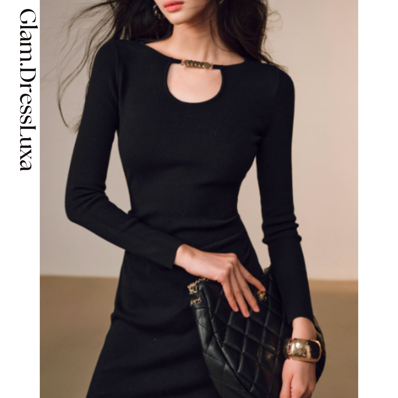コインチェーン オープンネック タイトニットドレス/3color_W778